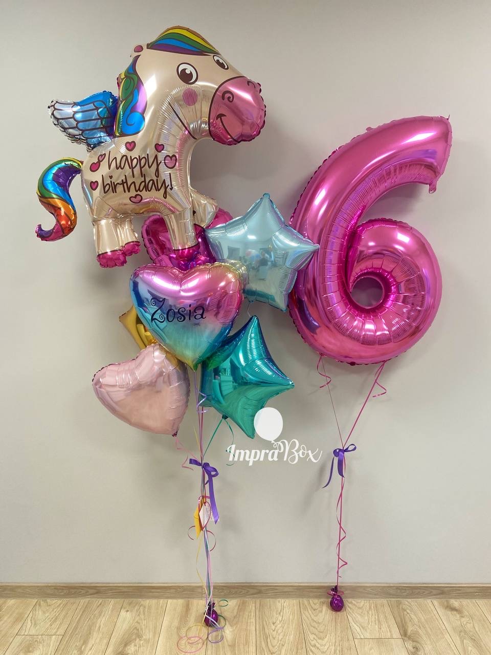 - efektowny zestaw kolorowych gwiazdek i serduszek + figura foliowa jednorożca z napisem Happy Birthday